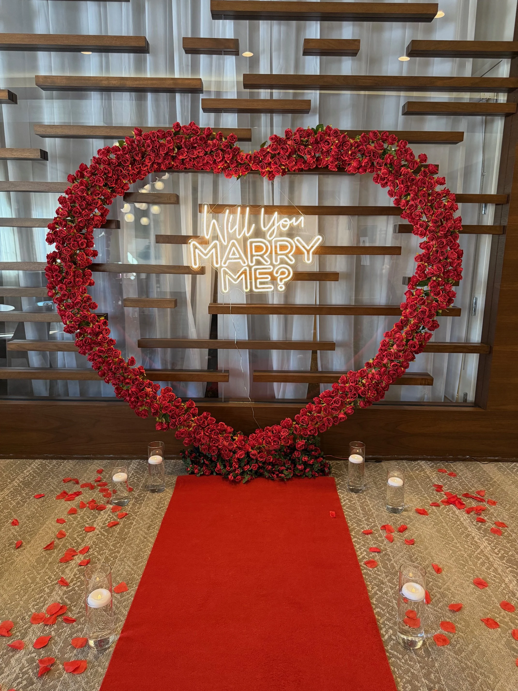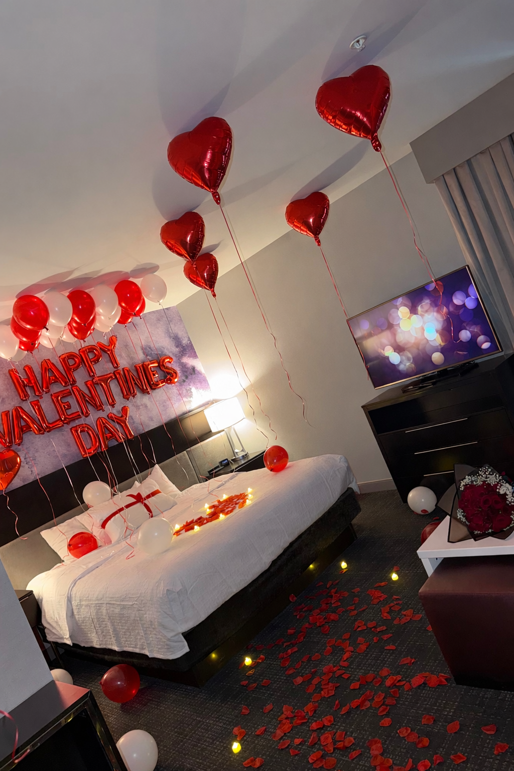 Transform your hotel room into a romantic paradise with elegant balloons, flickering candles, and rose petals that create an ambiance of pure bliss. Enhance the atmosphere with a stunning custom balloon banner, adding a personalized touch to your special occasion. Perfect for anniversaries, proposals, or just indulging in luxury, this setup promises to turn any moment into a cherished memory.